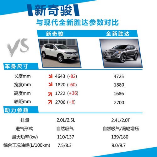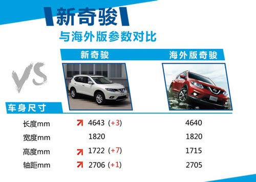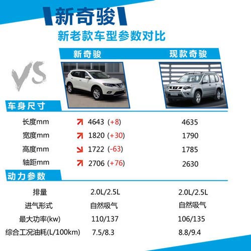 國產現款奇駿車身尺寸分別為4635/1790/1785mm,軸距為2630mm,而新款奇駿軸距在現款基礎上加長了76mm,其乘坐空間及舒適性有了很大提升,不僅如此,新奇駿在動力方面也有所提升,新車在動力方面依然延用了現款的2.0L和2.5L自然吸氣式引擎,其最大功率分別為110kw和137kw,百公里油耗則分別為7.5L和8.3L,在動力提升的同時,也充分提升了其燃油經濟性。