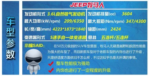 動力方面,2013款牧馬人使用了3.6L發動機,并且這臺發動機還入選過“沃德十佳發動機”榜單,變速箱也是5擋自動,最主要的就是這套動力系統不再只是油老虎的代名詞了,百公里基本可以控制在15L以內。