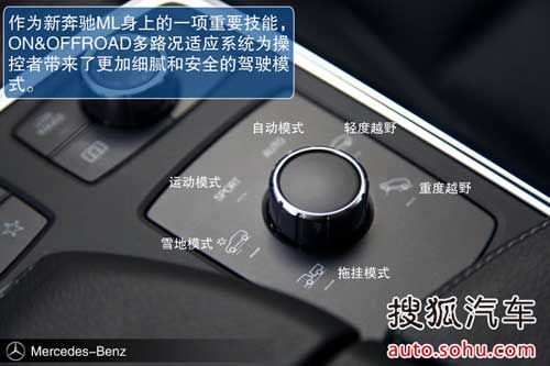作為新奔馳ML身上的一項重要技能,ON&OFFROAD多路況適應系統(tǒng)為操控者帶來了更加細膩和安全的駕駛模式。從設計方面來看,新奔馳ML不同操控模式的選擇方式與路虎覽勝有些相似,這套系統(tǒng)能夠提供包裹自動模式、運動模式、雪地模式、拖掛模式以及兩種程度越野模式在內(nèi)的六種選擇。當選擇任何一種模式,系統(tǒng)都會對發(fā)動機、變速箱、AIRMATIC空氣懸掛、轉(zhuǎn)向系統(tǒng)以及牽引力控制系統(tǒng)進行相應調(diào)節(jié),另外中控屏幕和儀表盤行車電腦也會隨時向操控者顯示當前狀態(tài)。