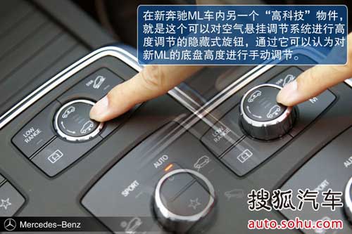 在新奔馳ML車內(nèi)另一個"高科技"物件,就是這個可以對空氣懸掛調(diào)節(jié)系統(tǒng)進行高度調(diào)節(jié)的隱藏式旋鈕,通過它可以人為對新ML的底盤高度進行手動調(diào)節(jié)。另外,在這個旋鈕的周圍還提供有低速四驅(qū)、陡坡緩降以及手動換擋模式等按鈕。