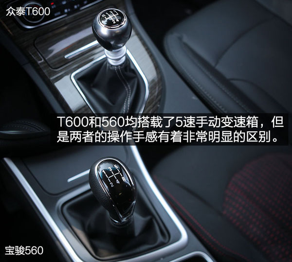 變速箱方面,雖然我們這兩臺試駕車都搭載了5速手動擋變速箱,而且兩者的手感卻有著非常明顯的區(qū)別。寶駿560擋位的行程比較長,入擋感比較綿緩,很柔;相比之下,T600的行程要短一些,而且擋位很緊,入擋感更剛硬,更干脆。