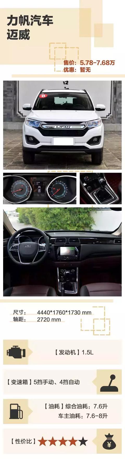 點評: 力帆旗下的產品從小型車到緊湊型車,從微面產品再到SUV車型,其種類并不算少。不過其產品設計總是相貌平平,直到全新邁威的出現給了大家全新的感受,時尚硬朗的外觀,配置也是豐富,帶有無鑰匙啟動以及電動天窗,這些看得見的配置突顯了更高的性價比,畢竟價格擺在那。