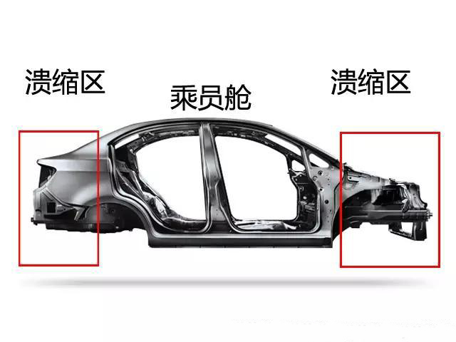 談這兩個問題我們先得講講汽車的車身結構。目前汽車主要采用非承載式車身,根據安全功能可以分為車頭車尾的潰縮吸能區域、乘員艙三個部分。值得一再強調的是,車子作為一個整體,并非各個區域越硬越好,而是“軟硬結合、安全更佳”。