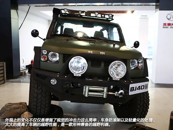 與量產版車型相比,經過改裝之后的北京(BJ)40攀巖版更加貼近了我心目中BJ212的形象,也更容易喚醒每個人心中的原始野性。其中,攀巖版的變化包括了新造型的前后保險杠、強化了的17英寸輪轂、金屬輪眉、輕量化越野半門和復古后視鏡。