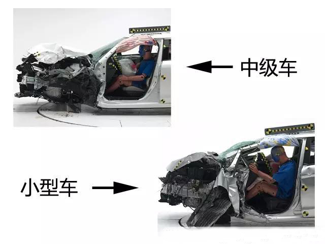 而車輛的大小主要影響其潰縮吸能區域的面積,拿小型車和中型車作比,可以明顯發現小型車前部更短小,同樣的沖擊下,乘員艙受到的威脅更明顯,車內乘員受到傷害的可能性就越高啦。