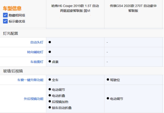 而在燈光配置上和車窗及后視鏡的智能化和電動(dòng)化方面,新哈弗H6 Coupe也大幅領(lǐng)先傳祺GS4(見下表)。