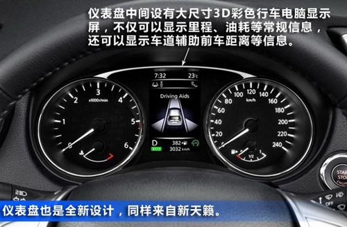 三幅式全新方向盤造型來自新一代天籟重新,具有濃濃的家族風格,但一點不令人感到“不爽”。其后的儀表盤也是全新設計,同樣來自新天籟。儀表盤中間設有大尺寸3D彩色行車電腦顯示屏,不僅可以顯示里程、油耗等常規信息,還可以顯示車道輔助前車距離等信息。