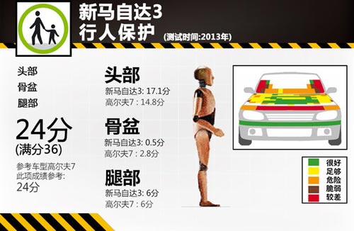 在行人保護(hù)測(cè)試中,新馬自達(dá)3的保險(xiǎn)杠對(duì)行人腿部保護(hù)比較到位,兩車(chē)的腿部保護(hù)測(cè)試均取得了6分滿(mǎn)分。新馬3發(fā)動(dòng)機(jī)罩前端區(qū)域?qū)π腥斯桥璞Wo(hù)欠佳,這項(xiàng)測(cè)試成績(jī)僅為0.5分,高爾夫7則拿到了2.8分。在行人頭部保護(hù)測(cè)試中,新馬3的發(fā)動(dòng)機(jī)罩中間區(qū)域能提供良好防護(hù),但A柱下端區(qū)域在碰撞中卻可能會(huì)對(duì)行人頭部造成一定的傷害風(fēng)險(xiǎn)。
