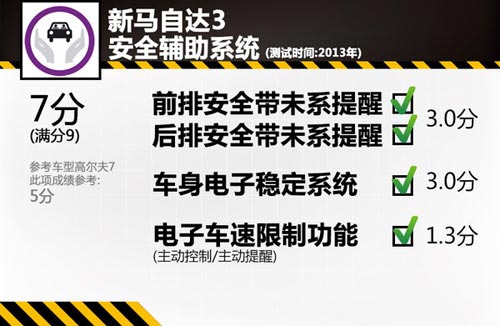 在車(chē)輛的輔助安全技術(shù)評(píng)估環(huán)節(jié)中,車(chē)速限制、ESP車(chē)身穩(wěn)定系統(tǒng)以及安全帶未系提示都是其評(píng)估項(xiàng)目,每項(xiàng)裝配技術(shù)都將決定最終分值的高低。新馬自達(dá)3全部配備了以上安全輔助系統(tǒng),并且達(dá)到了測(cè)試要求。而高爾夫7僅前排具有安全帶未系提示,后排座椅并沒(méi)有配備,并且此車(chē)也沒(méi)有裝備電子車(chē)速限制系統(tǒng)。車(chē)輛安全輔助系統(tǒng)測(cè)試滿(mǎn)分為9分,新馬3的成績(jī)?yōu)?分,比高爾夫7多出2分。