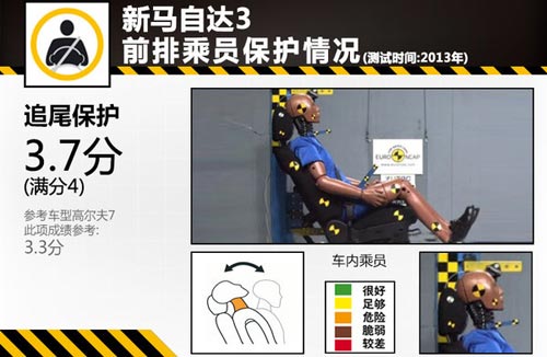 在模擬追尾碰撞時(shí)對(duì)車(chē)內(nèi)乘員頸部保護(hù)的測(cè)試中,新馬自達(dá)3和高爾夫7的座椅以及頭枕可以在追尾碰撞事故時(shí)為車(chē)內(nèi)乘員提供良好的保護(hù),避免頸椎過(guò)度屈伸的損傷。兩車(chē)成績(jī)分別為3.7分和3.3分。