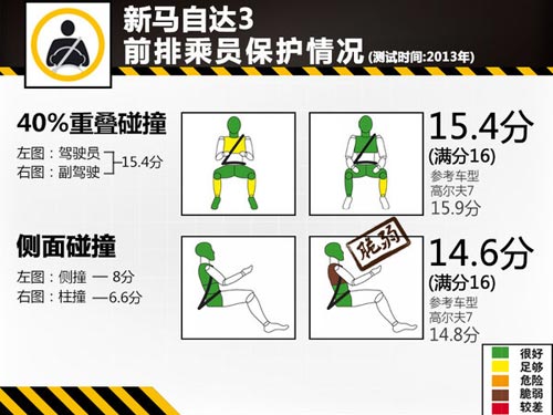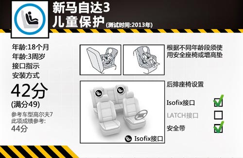 兒童保護(hù)也是評(píng)定一款車(chē)型的重要標(biāo)準(zhǔn)之一,在正面和側(cè)面碰撞測(cè)試中,兒童座椅中的18個(gè)月和3周歲模擬假人都得到良好保護(hù)。在兒童座椅安全接口提示和安裝方式方面,新馬自達(dá)3在后排座椅提供了兩個(gè)ISOFIX接口,安裝指示的各種標(biāo)識(shí)非常清晰,只是在后排中間座位安裝兒童座椅時(shí),因中央地板隆起給安裝造成了麻煩。此車(chē)副駕駛安全氣囊也可以關(guān)閉,以便允許在座位上使用背向式兒童安全座椅,并且能為駕駛員提供清晰的信息指示。兒童保護(hù)測(cè)試成績(jī)滿(mǎn)分為49分,新馬3成績(jī)?yōu)?2分,比高爾夫7低了2分。