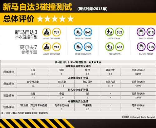 新馬自達(dá)3最終碰撞評(píng)定星級(jí)為最高的5星,我們這次選擇的參照車(chē)型高爾夫7同樣也是5星。從四大項(xiàng)測(cè)試的成績(jī)來(lái)看,兩車(chē)不分軒輊。在成年乘員安全項(xiàng)以及行人安全項(xiàng)測(cè)試成績(jī)上兩車(chē)得分均一致,分別是34分和24分。在車(chē)輛輔助安全項(xiàng)測(cè)試中,新馬3成績(jī)?yōu)?分,比高爾夫7的5分高出2分;而在兒童安全項(xiàng)測(cè)試中,高爾夫7則比新馬自達(dá)3高出2分。