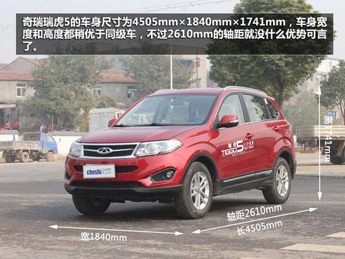 奇瑞瑞虎5的車身尺寸為4505mm×1840mm×1741mm,車身寬度和高度都稍優于同級車,不過2610mm的軸距就沒什么優勢可言了。