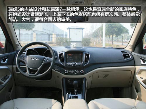 瑞虎5的內飾設計和艾瑞澤7一脈相承,這也是奇瑞全新的家族特色,游艇式環抱設計緊跟潮流,上深下淺的色彩搭配也很有層次感。整體感覺簡潔、大氣,很符合國人的審美。