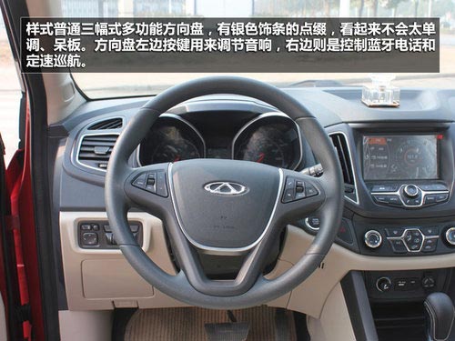樣式普通三幅式多功能方向盤,有銀色飾條的點綴,看起來不會太單調、呆板。方向盤左邊按鍵用來調節音響,右邊則是控制藍牙電話和定速巡航。