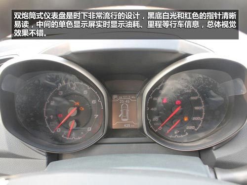 雙炮筒式儀表盤是時下非常流行的設計,黑底白光和紅色的指針清晰易讀,中間的單色顯示屏實時顯示油耗、里程等行車信息,總體視覺效果不錯。