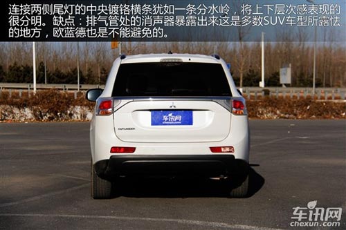 尾部設計上,連接兩側尾燈的中央鍍鉻裝飾條猶如一條分水嶺,將上下層次感表現的很分明。缺點是排氣管處的消聲器暴露出來這是多數SUV車型所露怯的地方,歐藍德也不例外。
