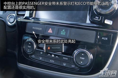 中控臺除了常規功能區外,其中ECO節能模式和PASSENGER安全帶未系警示燈布局相對較獨立,值得一提的是如果主/副駕駛安全帶未系,不僅發出警報聲同時警示燈也會自動亮起,雙重安全設計還是比較人性化的。