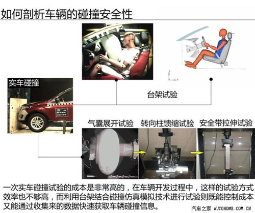 再來說說整車,相比于各個部件的測試,圍繞整車進行的仿真模擬試驗則有著更積極的意義,通過電腦模擬,開發人員即可獲得整車在各種碰撞條件下的車身狀態和數據,在開發過程中,基于成本考慮,整車的碰撞測試對仿真模擬試驗有著更強的依賴性。盡管成本是制約試驗的一個因素,但實車碰撞試驗在整個開發過程中仍必不可少。至于成本, 我們以瑞虎5為例,一款正處于研發階段的瑞虎5的整車成本在25萬元左右,進行一次實車碰撞的試驗成本在15萬元左右,再加上周邊的一些費用,進行一次實車碰撞試驗的成本在50萬元左右。