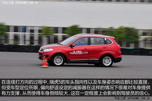 這款低配車沒有沒有配備車輛穩定系統(高配車裝配的是9.0版本的博世ESP),所以,動態控制全靠底盤性能。瑞虎5在70km/h的車速下可以順利通過這段S型操穩路,但還是車身姿態的問題,在緊急變線的情況下,這或多或少都會對駕駛員的信心有所影響。