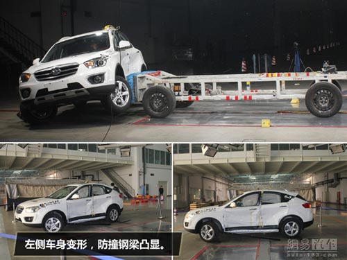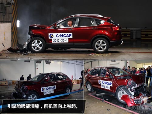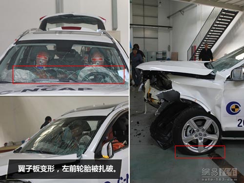 從試驗現場看整車向右后方倒退,前引擎艙潰縮變形,防撞梁變形,左縱梁變形,左前輪胎受到擠壓,被扎破;副駕駛席乘員假人腿部與前艙接觸痕跡明顯;后排假人頭部與上頂梁內飾板接觸,痕跡明顯!