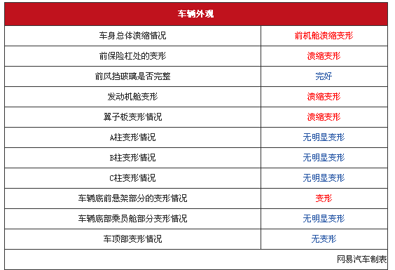 碰撞后,整車迅速向右后方呈一定弧度倒退,距離較遠;前引擎艙潰縮變形,近乎縮進一半;左前大燈破碎脫落;左側翼子板破碎,左前輪胎被扎破;A、B、C柱無明顯變形,車門可正常開啟,乘員可自行打開車門自救逃生。