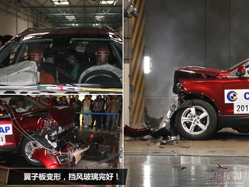 3、正面40%重疊可變形壁障碰撞試驗:整車向右后方倒退,前引擎艙潰縮變形,防撞梁變形,左縱梁變形,左前輪胎受到擠壓,被扎破;副駕駛席乘員假人腿部與前艙接觸痕跡明顯;后排假人頭部與上頂梁內飾板接觸,痕跡明顯!