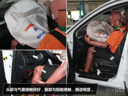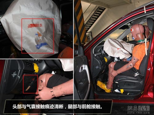 碰撞后,前排雙氣囊彈出,頭部與氣囊接觸,痕跡明顯;前排駕駛席假人腿部與前艙明顯接觸;副駕駛假人腿部與前艙有明顯接觸痕跡!