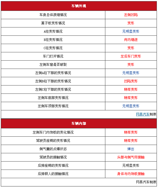 從現場來看碰撞時,側氣簾彈出,側氣囊偏離預設位置,被椅背擋住,沒有起到相應的保護作用;左側車身嚴重變形;前排假人坐姿正常,安全帶緊扣;后排假人運動幅度較大,身體與內飾板接觸,留有明顯接觸痕跡。