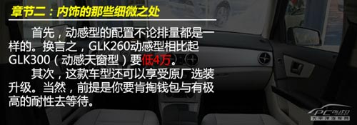經過一番體驗之后得出一個結論,動感型這個配置中,GLK260與GLK300均保持一致。作為破40萬的入門級車型,GLK260并沒有出現(xiàn)所謂的“縮水”現(xiàn)象,這是可以肯定的。