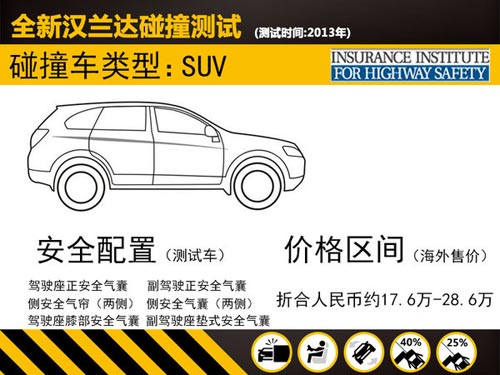 豐田2014年加大了在華新品投放力度,將有多款新車密集發布,其中就包括即將上市的全新漢蘭達。這款新車型剛剛在美國進行碰撞測試并公布了成績,網通社在經過對測試數據的整理和分析后發現新車整體安全保護出色,特別是在最嚴苛的小面積測試中對車內乘員的保護較為到位,下面就為大家解析一下這款全新SUV在碰撞測試中的表現。