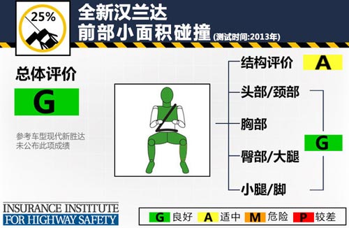 參加測試的車型為豐田新一代美規漢蘭達,最終的總體評價為最高級別“G”。新車在嚴苛的小面積碰撞測試項目中總成績是“A”(適中),在正面40%碰撞測試、側面碰撞測試、車頂強度和追尾保護測試中均取得了良好的成績。我們選擇的參照車型現代新勝達沒有公布小面積碰撞測試成績,其余4項總成績與全新漢蘭達一致,均為“G”(良好)。