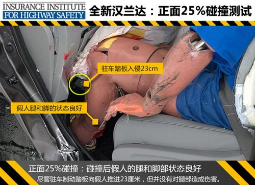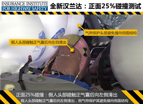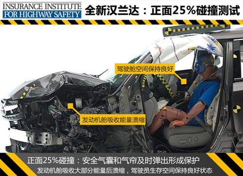 在最為嚴苛的正面25%碰撞測試中,全新漢蘭達受到撞擊后發動機艙吸收了大部分能量而潰縮,使得駕駛艙受到撞擊能量相應減弱,碰撞后駕駛員生存空間保持了良好狀態。撞擊后駕駛座正面、側面、膝部安全氣囊以及頭部側氣簾均及時彈出,對模擬駕駛員假人的頭部和軀干形成全方位保護。