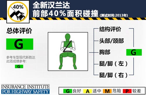 正面40%碰撞測試中,全新漢蘭達和現代新勝達不僅總成績均為良好,其中單項測試成績也均為良好,兩車在正面40%碰撞中對車內乘員的保護都很到位。