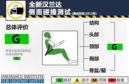 全新漢蘭達在側面碰撞中對車內乘員身體各部位均有充分的保護,新車裝備的側安全氣囊和側安全氣簾起到重要作用?,F代新勝達的側面碰撞成績也很出色,總成績和各單項成績均為良好。