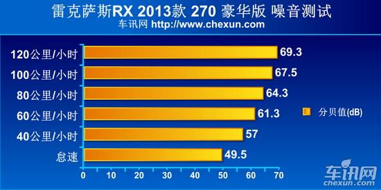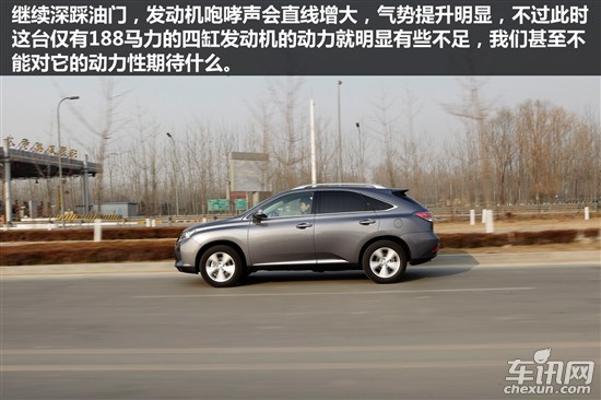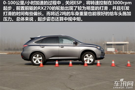 0-100公里/小時加速的過程中,關閉ESP,將轉速控制在3000rpm起步,前置前驅的RX270的輪胎出現了較為明顯的打滑,并且引發打滑的時間有些偏長。而將近2噸的車身重量也能很好的給車頭施加壓力。總體來說,起步姿態還算中規中矩。