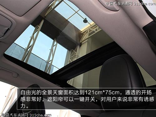 全系配備全景天窗顯得非常厚道,面積達到121cm*75cm,通透的開揚感非常好,遮陽簾可以一鍵開關,對用戶來說非常有誘惑力。
