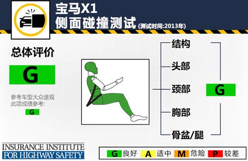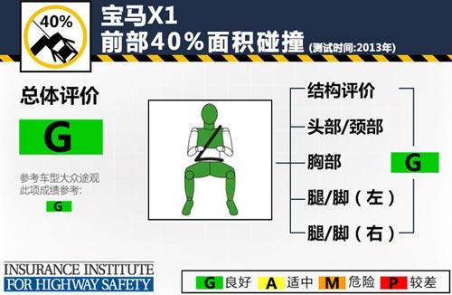 寶馬X1雖然總體評價和其余各項測試均取得最高級別“G”的良好成績,對車內(nèi)人員保護(hù)非常到位,但唯有小面積碰撞測試成績并不理想,碰撞后駕駛員生存空間受到較大入侵,車身安全結(jié)構(gòu)還有待加強(qiáng);同時模擬駕駛員的假人左側(cè)小腿和腳部都有受到傷害的風(fēng)險,在小面積碰撞中此車對乘員的保護(hù)應(yīng)進(jìn)一步加強(qiáng)。