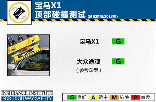 頂部碰撞主要測試車輛發(fā)生翻滾時車型結(jié)構(gòu)的變化,成績可反映出側(cè)翻時車身結(jié)構(gòu)的安全性,在這項測試中寶馬X1和大眾途觀均取得了良好的成績,為車內(nèi)乘員提供充分的保護(hù)。