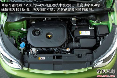 兩款車都搭載了2.0L的I-4汽油直噴技術發動機,最高功率164hp,峰值扭力151 lb-ft。動力性能不錯,尤其是爬坡時候的表現,六速自動變速箱將動力傳輸到前輪,雖然還不算是性能方面的佼佼者,不過對比之前一代SOUL,還是有了很大的提升。