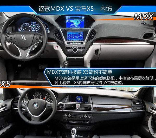 首先從外觀上來看,謳歌全新MDX和寶馬X5造型均顯得非常時尚,MDX盾牌形狀的格柵設計以及大面積的鍍鉻飾條十分搶眼,尤其是采用謳歌獨特Jewel Eye 5眼光學照射系統的前燈組,充滿動感的同時顯得“炯炯有神”; 寶馬X5的“雙腎式”進氣格柵早已獨樹一幟,雙圓大燈與進氣格柵相連接,不規則造型的“天使眼”看上去也更加有型。