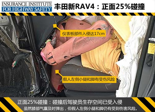 正面25%偏置重疊碰撞測試是美國IIHS(公路安全保險協(xié)會)推出的“全球最為嚴(yán)苛的安全碰撞考核”,雖然在這項(xiàng)難度較大的測試中要取得優(yōu)秀成績會有相當(dāng)?shù)碾y度,但是同級車型中總會有車企做到。此次參加測試的豐田新RAV4和三菱歐藍(lán)德在這項(xiàng)嚴(yán)苛的小面積碰撞中表現(xiàn)的差異就相當(dāng)大,前者總成績拿了最低級別的“P”(較差),后者則拿到了“G”(良好)。此外,新RAV4的測試車裝備了包括膝部氣囊和坐墊式氣囊在內(nèi)的全方位安全氣囊,但遺憾的是氣囊數(shù)量與碰撞成績并沒有成正比。相信豐田在車身安全性方面能夠迎頭趕上,讓車內(nèi)乘員在嚴(yán)苛的碰撞測試中也能夠得到良好和足夠的防護(hù)。