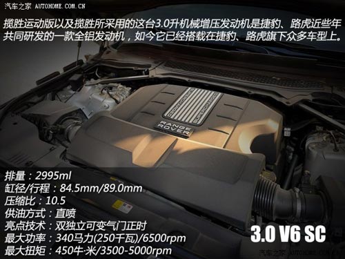 千萬別小瞧這臺V6發動機,即使是驅動攬勝運動版和攬勝這樣的大塊頭,它的動力也顯得很充沛。經過工程師的重新調校,這臺3.0升機械增壓發動機的最大功率已經攀升至340馬力,最大扭矩450?!っ?,這樣的數字已經全面超越了寶馬X5 3.0T和保時捷卡宴3.0機械增壓版,而且采用全鋁車身的新一代攬勝運動版整備質量比X5和卡宴更輕,理論上攬勝運動版應該跑得更快,而結果也確實如此。