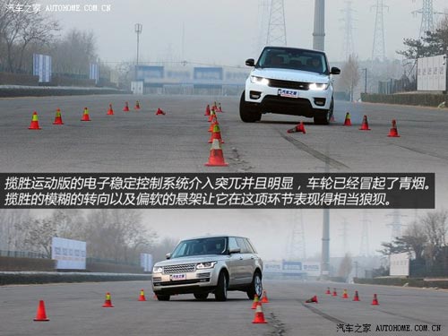 攬勝運動版在抑制車身側傾方面的能力相比攬勝要稍好一些,方向盤的指向性也要清晰不少。不過它的車身穩定控制系統無法完全關閉,而且介入點更早,介入時的力度也比攬勝更強。在繞樁過程中,每次逼近極限時,電子穩定系統都會以極大的力度進行干預,繞樁測試很難平順進行。不過對于日常駕駛的安全性來說,電子系統的謹慎也是可以理解的。