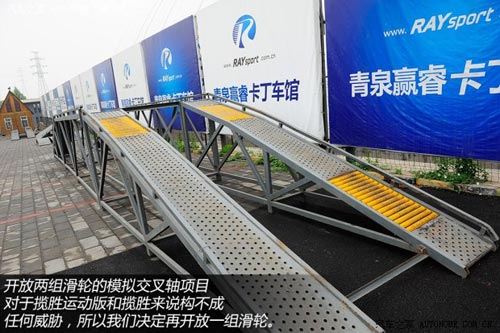 接下來我們分別駕駛兩款車上架子來看一看它們各自的表現。首先我們開放了左前和右后兩個滑輪組,用來模擬交叉軸的狀況。正如之前所料,這個項目對于這兩款車來說根本構不成任何威脅,整個過程很輕松。所以我們決定再開放一組滑輪,看看在只有一個輪胎擁有抓地力的情況下兩款車能否順利通過測試。