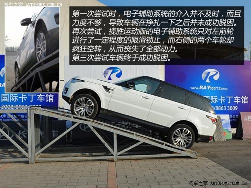 既然采用了相同的動力系統,那么為什么兩款車同樣在面對三個開放式滑輪組時會有不同的表現呢?原因恐怕就在于兩款車對于電子輔助系統的設定并不相同。在這項測試過程中,我們可以清晰地感覺到攬勝的電子輔助制動介入的非常及時,并且準確。而攬勝運動版則稍顯猶豫,而且制動力度不夠,動力分配不夠準確。這大概和兩款車的定位有關,畢竟攬勝運動版更偏重公路操控性,在不影響安全的前提下,車輛留給駕駛者的自由度更高,所以電子系統介入的及時性不如攬勝也就不難理解了。