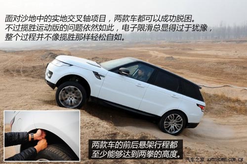 雖然兩款車最終都通過了我們的場地測試和野外測試,但從整個過程來看,攬勝運動版明顯不如攬勝更加輕松。這主要是因為攬勝運動版的電子系統在偵測到輪胎打滑時并不能及時有效的采取制動。相反攬勝對于四輪動力的分配更為“老道”,懸空或打滑的車輪得到有力的制動,動力被很多的傳遞到需要的車輪上,通過相同項目時要輕松的多。