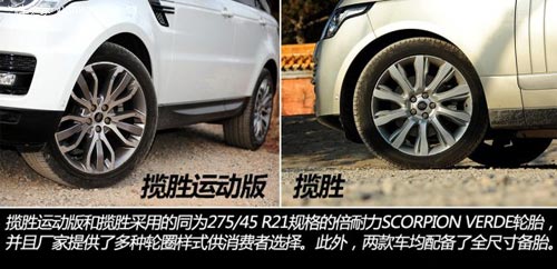 為最大限度提升車輛的個性化選擇,全新一代攬勝運動版和攬勝都為用戶提供了從19英寸到22英寸的一系列鋁合金輪圈定制選項,而且攬勝運動版的消費者還可以選裝紅色的Brembo制動卡鉗。我們試駕的這兩款3.0L V6機械增壓車型采用的同為275/45 R21規格的倍耐力SCORPION VERDE輪胎,這是一款更加適合在普通路面行駛的SUV輪胎。