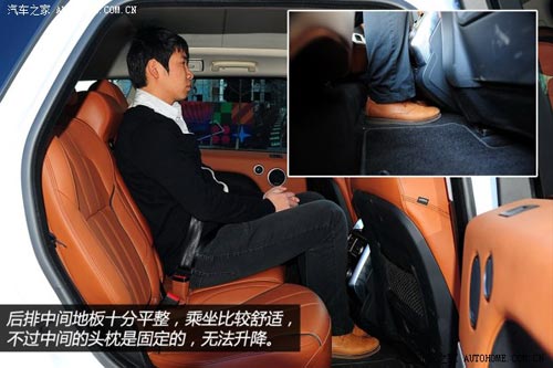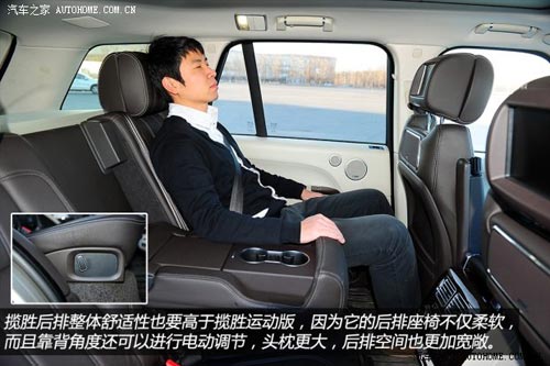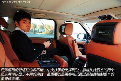 由于車身長度和高度都有優勢,所以攬勝的乘坐空間比攬勝運動版更為寬敞一些,不過體驗者的后排腿部空間依然只有一拳三指。