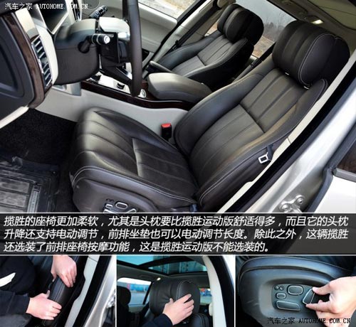無論是前排舒適性,還是后排舒適性,攬勝都要高于攬勝運動版,它的座椅寬大、柔軟,尤其是頭枕讓人記憶猶新,我的同事在之前的攬勝試駕文章中曾經用“D罩杯”來形容它,舒適性可見一斑。除此之外,攬勝的前后排座椅在功能上也比攬勝運動版更豐富,它的前排可以選裝座椅按摩功能,后排支持電動調節靠背角度,從此長途旅行不再疲憊。
